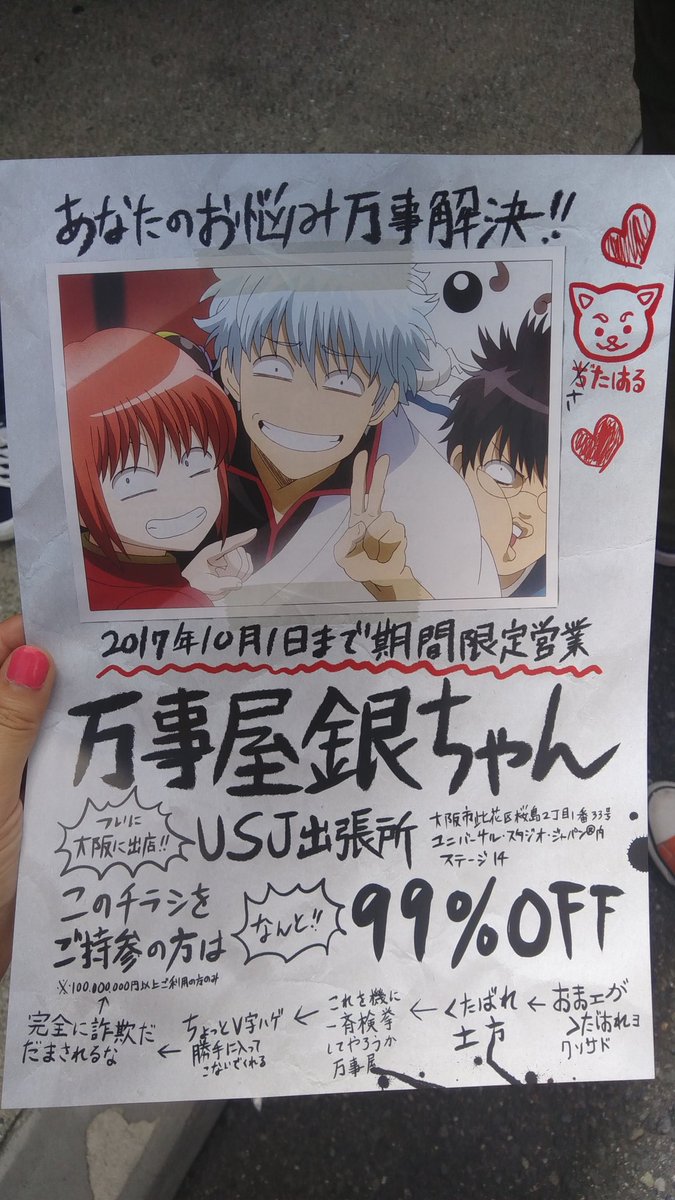 See all photos taken at 銀魂ライブ・トーク by 28 visitors USJの「銀魂ライブトーク」を紹介します。 夏休みの期間限定ショーと言えば、漫画やアニメを中心としたものが定番ですよね。 今年の夏も、様々な行楽地やレジャースポットで、いろんなあ漫画やアニメとコラボしたイベントが行われる予定になっています。 そんな中、今年のUSJは 銀魂ライブ・トークの会場の前では、このようなチラシを頂くことができました。 17年10月1日までの期間限定営業 、万事屋銀ちゃんusj出張所と書かれています。 裏面をみてみると、相談内容の例が書かれていました。 銀魂はそーゆーストーリーなんです